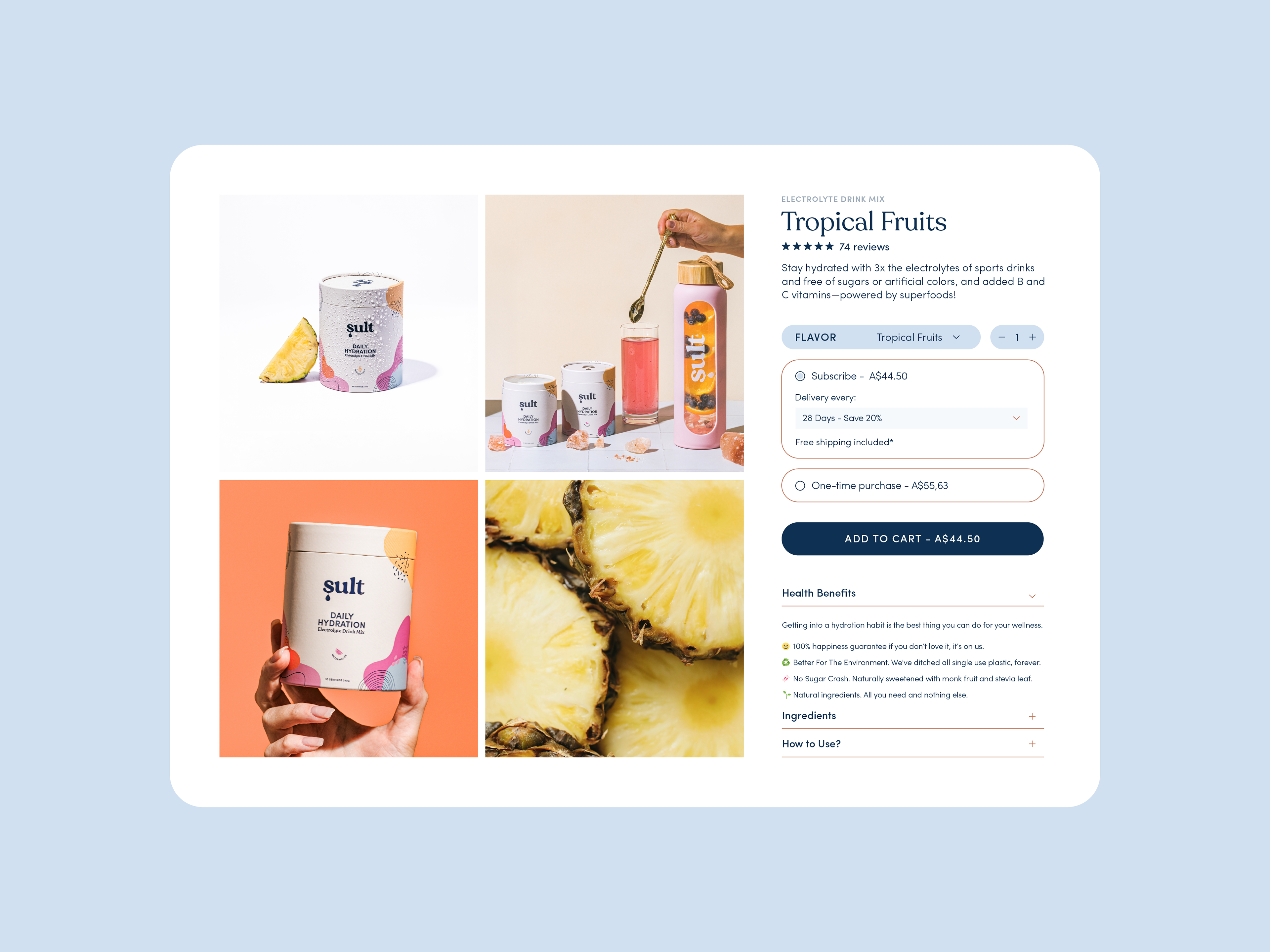 Sult Hydration is an Australia-based health and wellness brand specializing in electrolyte drink mixes designed to promote hydration and vitality. Inspired by the active Australian lifestyle, the brand addresses the common challenges of dehydration caused by constant sun exposure, running, surfing, and outdoor activities. Additional factors like alcohol consumption, high-stress environments, and demanding work schedules further highlight the need for effective hydration solutions.